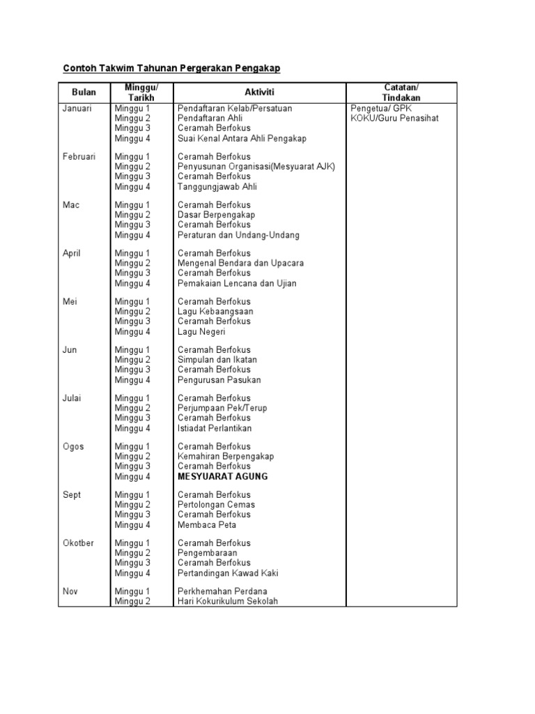 . Lampiran 18 Contoh Takwim Tahunan Pergerakan Pengakap Bulan Minggu Tarikh Minggu 1 Minggu 2 Minggu 3 Minggu 4 Pendaftaran KelabPersatuan Pendaftaran Ahli Ceramah Berfokus Suai Kenal Antara Ahli Pengakap Februari Minggu 1 Minggu 2 Minggu 3 Minggu 4 Ceramah Berfokus Penyusunan OrganisasiMesyuarat AJK Ceramah Berfokus Tanggungjawab Ahli Mac. CONTOH EVIDENS SKPMg2 2021. Merancang takwim tahunan sekolah pada awal tahun.